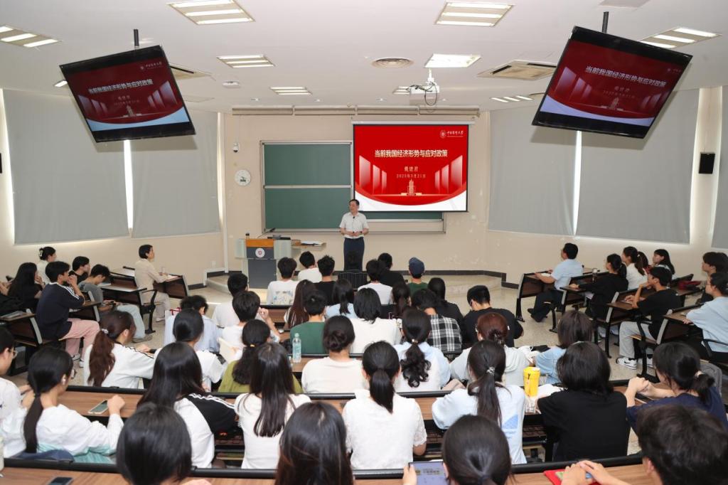课堂上,戴建君以“什么是经济”为切入点,围绕2024年经济建设成就、2025年经济形势、我国经济面临的机遇与挑战、应对挑战和解决经济问题的方案等方面展开深入讲解。他旁征博引,结合国内外形势及中美贸易战,细致梳理国家经济政策与工作。尤其在分析今年经济形势时,他还深入结合生物医药产业发展和学校实际,突出稳就业、促发展的重要性。谈及新发展理念、新发展格局及财政、货币政策时,他积极与学生互动交流,深入浅出的讲解,让在场学生对当前经济形势有了更为清晰的认识。