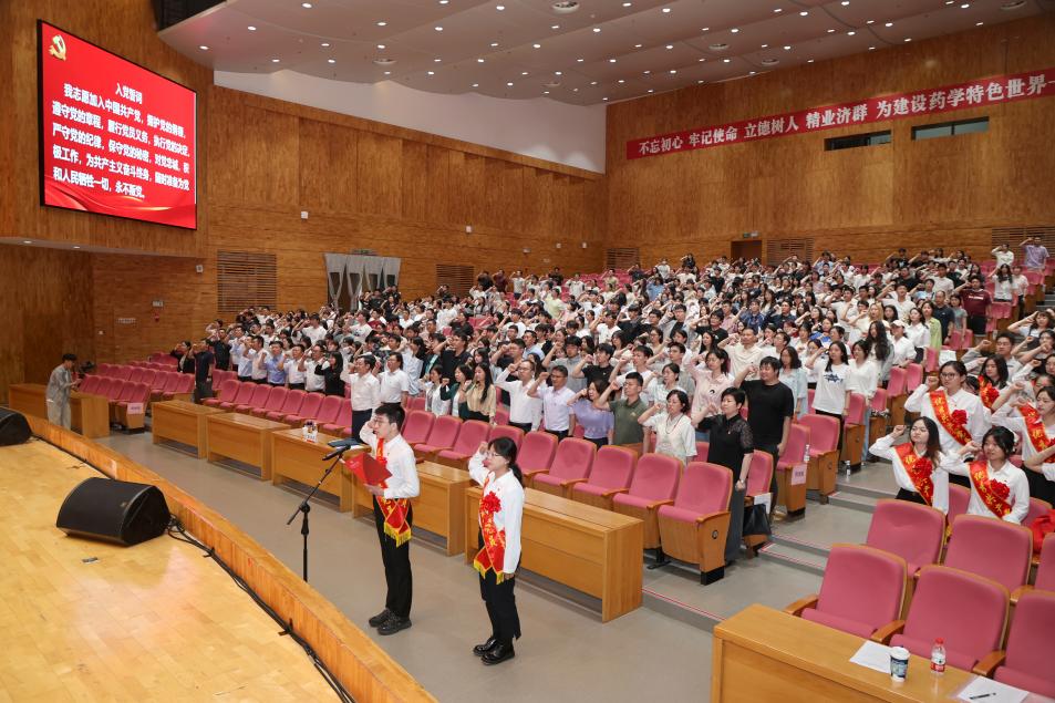 活动最后,由2025届药学专业本科毕业生吕展墨领誓,2025届药事管理专业本科毕业生张佳怡监誓,全体与会党员重温入党誓词。