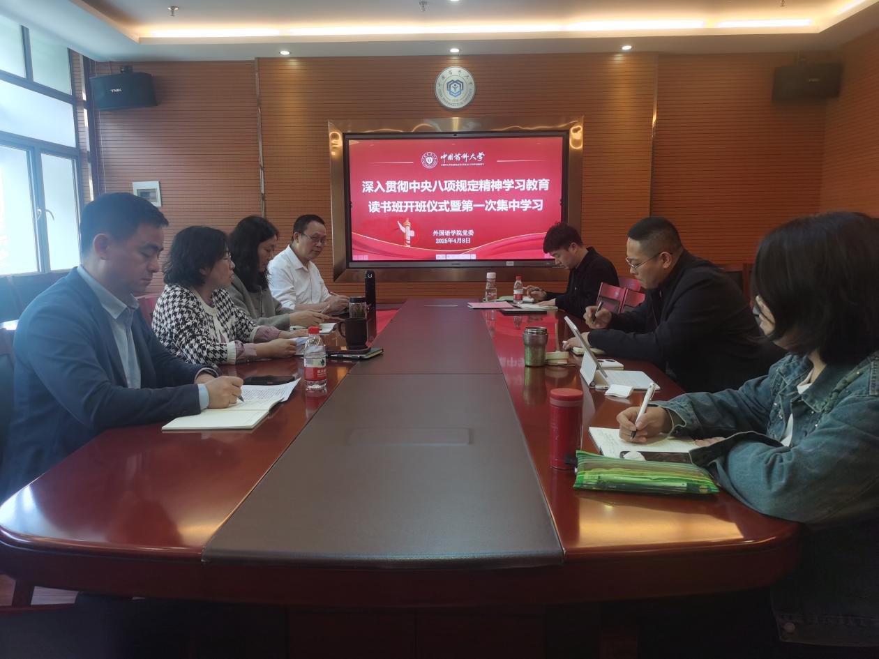 4月8日下午,外国语学院在经管文楼召开深入贯彻中央八项规定精神学习教育读书班开班仪式暨首次集中学习。学院两委委员、党支部书记参加学习。