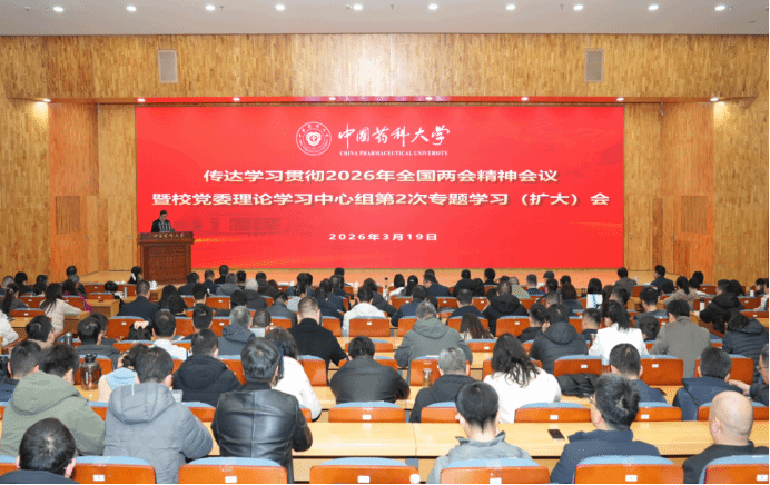 会上,全国政协委员、校长郝海平以《坚定信心、开拓进取,奋力书写“十五五”高质量发展新篇章》为题作专题辅导报告。他以全国两会“五大关键词”为切入点,系统介绍了2026年政府工作报告的主要内容,重点传达了习近平总书记在参加江苏代表团审议时的重要讲话精神以及习近平总书记在政协联组会上的重要讲话精神。与此同时,他简要介绍了个人履职情况,并结合学校实际和自身学习体会,深入阐明了正确政绩观的核心要义,畅谈了未来学校改革发展思路。他强调,政府工作报告中首次将生物医药列为“新兴支柱产业”,全校上下要锚定教育的政治属性、人民属性、战略属性,前瞻布局生物医药制造和人工智能等交叉学科的未来产业发展方向,加速推动“人工智能+医药”融合发展这一时代命题在学科建设、人才培养、科研攻关等方面从技术赋能迈向范式变革,持续深化有组织科研,强化跨学科协同攻关,力争在疾病机制与靶点发现、药物开发与优化、构建药物知识图谱等领域取得标志性突破,为打造原始创新策源地和人才培养高地贡献智慧和力量。